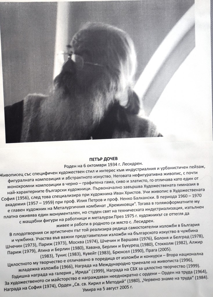 Картини от Художествената галерия в Ловеч гостуват на Художествена галерия „Илия Бешков“ в Плевен като част от изложба на художника Петър Дочев (1934 -2005). Експозицията представя общо 17 живописни платна, от които 13 са от Ловеч. Те много ясно представят двата периода на известния художник – индустриалните пейзажи от 70-те години на 20 век и последвалата артистична еволюция към метафизика и синтезирана мощ, видна в по-късните му платна.